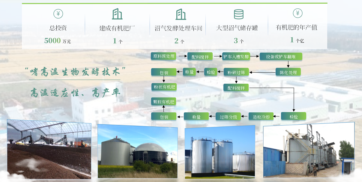 公司固定資產(chǎn)總投資1.6億元,建成有機肥廠1個,沼氣發(fā)酵處理車間2個,大型沼氣儲存罐3個,公司利用糞便和農(nóng)作物秸稈,建有年產(chǎn)2萬噸生物有機肥廠,引進臺灣金匯獨創(chuàng)的“嗜高溫生物發(fā)酵技術”,經(jīng)過高溫滅菌10個小時發(fā)酵,再經(jīng)過配方混合,轉化成各種型號的有機肥料,年產(chǎn)值為1個億。